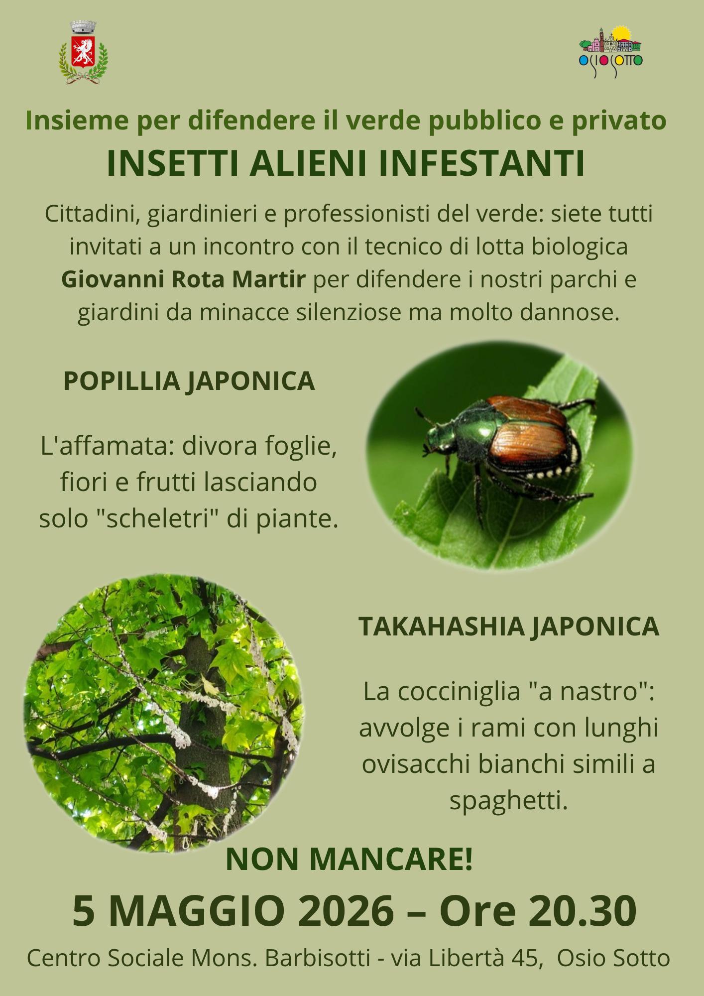 Cittadini, giardinieri e professionisti del verde siete invitati all'incontro informativo con il tecnico di lotta biologica Giovanni Rota Martir per imparare a proteggere parchi e giardini da minacce silenziose ma molto dannose.